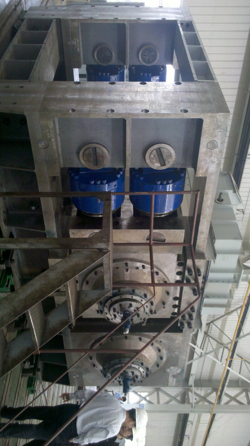 该辊压机的规格为TRP140X140,通过量为500—560t/h。中材装备集团在理论和试验研究的基础上,并结合钢渣的特性,对本辊压机进行了重新开发设计,在压辊结构和加压模式等方面进行了创新从而提高了可靠性,为高效超细粉碎钢渣提供了一条新技术路线。