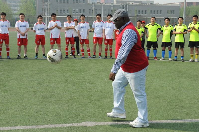 在全场观众的注目下,尼日利亚大使Patrick Olusola Onadipe先生走向足球场中央,愉快地为此次足球友谊邀请赛开球。随着一声哨响,首场参赛的4个队正式开始了比赛。中材“尼日利亚杯”足球友谊邀请赛开幕式圆满结束。